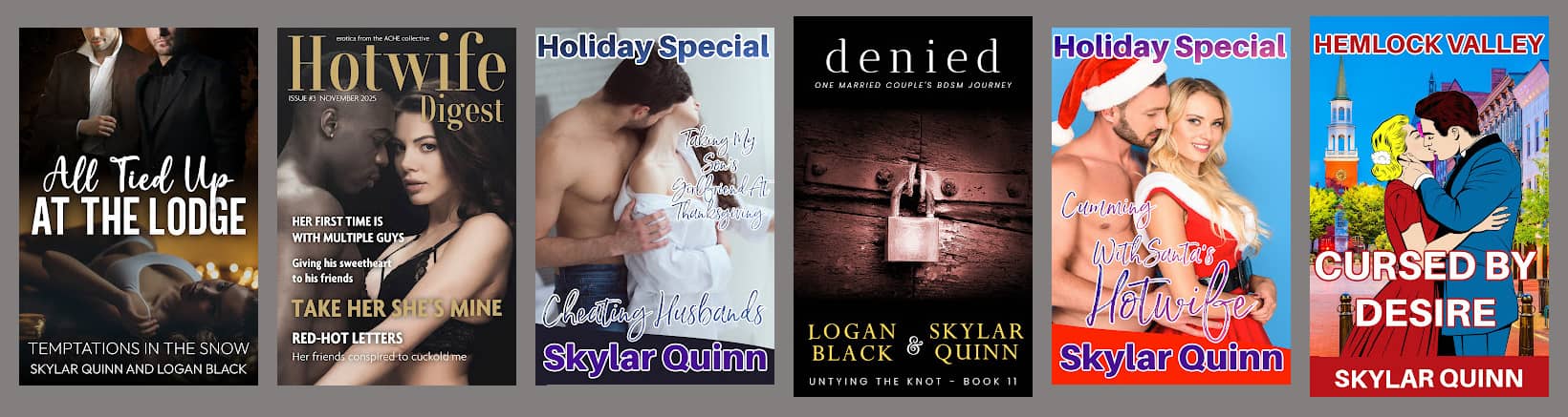 Hey Hey, CRUSHES! November always feels like the month where everything speeds up and slows down at the same time. Holiday chaos, creative deadlines, and a to-be-read pile that could double as home décor. Let’s dive into what's new in the world of Skylar. 🔥 CURRENT PROJECT UPDATESAt First Sight: Voyeur — Final Edits CompleteThe hotel room scene is electric, the Ann and Margie wrap-up chapter is polished, and the blurb and keywords are locked. This one is ready for its moment. This means I only have 1 book left in this series to write, At First Sight: Dom, and then I'm done! My Hotwife Life — Full Series LockedI am so pleased to announce that for 2026 I have a new hotwife series coming out. This time around, instead of flying by the seat of my pants, I am doing a ton of planning! All 12 blurbs, tones, POVs, and outlines are finalized. This month, I've focused on polishing Playing with Fire, Wine Club Confessions, and finalizing the emotional beats that drive this series. These are the first two books in this twelve book series. Bound to Burn — Drafting Starts NowOutline. Blurb. Chapter-by-chapter plan. All locked in. I've officially begin writing chapters this month, and I cannot wait for you to meet Sadie and Nadir on the page. It has been a while since I was so excited about a large scale project but this one has me all sorts of inspired. Expect this to be a full blown novel. My plan, actually, is to make this more erotic in romance and less 'erotica', but you know what they say about best laid plans! Hemlock Valley: Cursed By DesireThe new novella is finished and ready to charm you KU readers with its slow-burn magic, sensual tension, and Hemlock Valley heat. ✨ NEW RELEASES & KU FAVORITES11/07 — Holiday Special: Taking My Son’s Girlfriend At ThanksgivingA messy, festive, high-stakes holiday hookup. 11/13 — Hotwife Digest #3: Hotwife Book 12 – Caught At The BarA bold, irresistible bar-night temptation. 11/14 — Holiday Special: Cumming With Santa’s HotwifeNaughty list certified. 11/21 — Denied: One Married Couple’s BDSM JourneyKindle Unlimited Intense, layered, intimate. One of your kinkiest emotional journeys yet. 11/26 — Hemlock Valley: Cursed By DesireKindle Unlimited Magic, yearning, and the spark that changes everything. 11/28 — All Tied Up At The LodgeKindle Unlimited Snow. Heat. Rope. Need we say more? 🔥 EROTICA ON KINDLE UNLIMITED — FEATURED PROMOLooking for your next binge? I’m part of a special Erotica on KU promo running through November and December, featuring some of the spiciest, boldest, most addictive stories on Kindle Unlimited. Browse the entire collection here: 👉 https://books.bookfunnel.com/spiciest-smut-nov-dec/liv2uloo43 📅 WHAT’S COMING UP NEXTCheating On Mrs. ClausA workplace North Pole holiday affair with humor, heat, and a very naughty list. Taken By My NeighborSuburban temptation at its absolute finest. Holiday Special Print BookPerfect for gifting. Or hiding in your nightstand. Denied: One Married Couple’s BDSM JourneyBook 12 of 24 in my shared series with Logan Black. More emotional depth, more layered kink, and more of the journey readers love. 🤍 FRIEND’S CORNER — Featuring Logan BlackI’m thrilled to spotlight my dear friend and co-author Logan Black this month. If you love: • flawed, magnetic men • messy, addictive love stories • unforgettable female leads • intense emotion wrapped in heat … pick up one of Logan’s books. You won’t regret it. Check out his newest release: CRUSHED: F. Leonora Solomon 💬 A NOTE FROM MEI’m heading into 2026 with so much fire in my blood. New worlds. New couples. New secrets. New heat! A slate of stories that feel bigger, bolder, and more intimate than anything I’ve released before. Thank you for being here. Thank you for reading, reviewing, sharing, messaging, and letting my stories curl into your lives the way they do. I’m building the best year of my career, and I can’t wait for you to experience every twist, kiss, and shockwave. As a thank-you, here’s a little something for my loyal readers: 🎁 25% OFF my annual Substack plan👉 https://skylarq.substack.com/HolidaySpecial I cannot wait to spend another year creating magic with you. XoXo, Skylar |